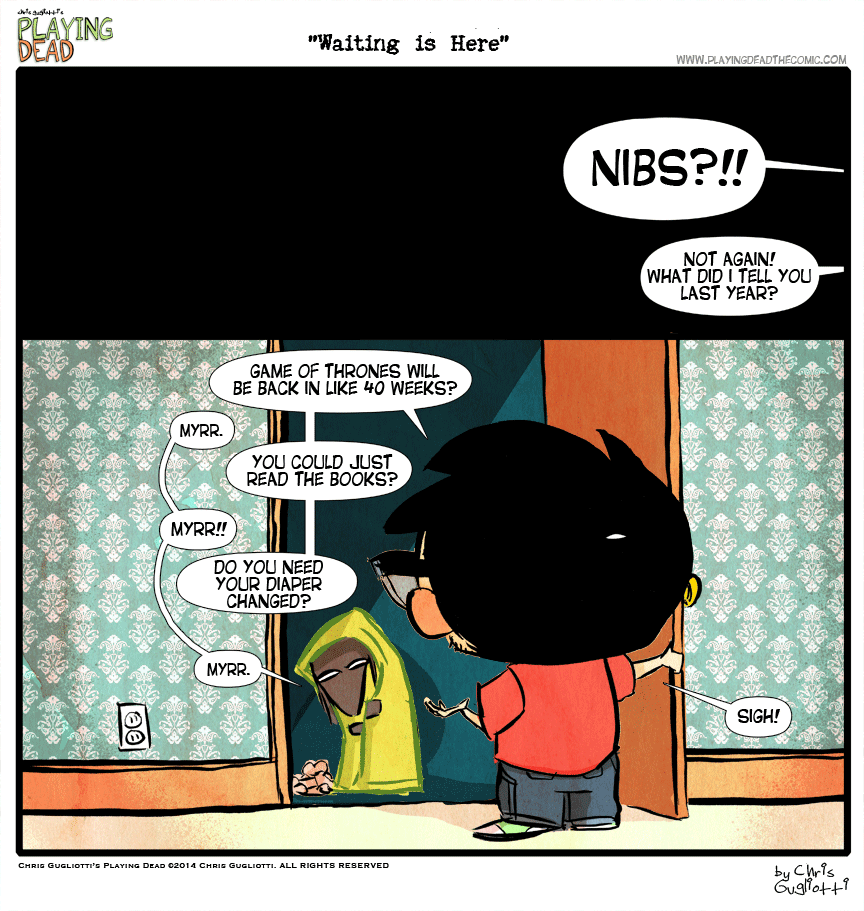 A Song of Sadness and Waiting by cgugliotti on June 28, 2016 at 9:00 am Chapter: comics In which we must wait ANOTHER year. └ Tags: a song of fire and ice, anxiety, autobiographical, chris gugliotti, comic, comic strip, comics, cosplay, dachshund, dog, dragon, fantasy, friendship, game of thrones, george r.r. martin, jon snow, khaleesi, magic, man's best friend, man-child, nibbles, nibbles the dachshund, playing dead, science fiction, web comic, Web comics, webcomic, webcomics Comments Off on A Song of Sadness and Waiting