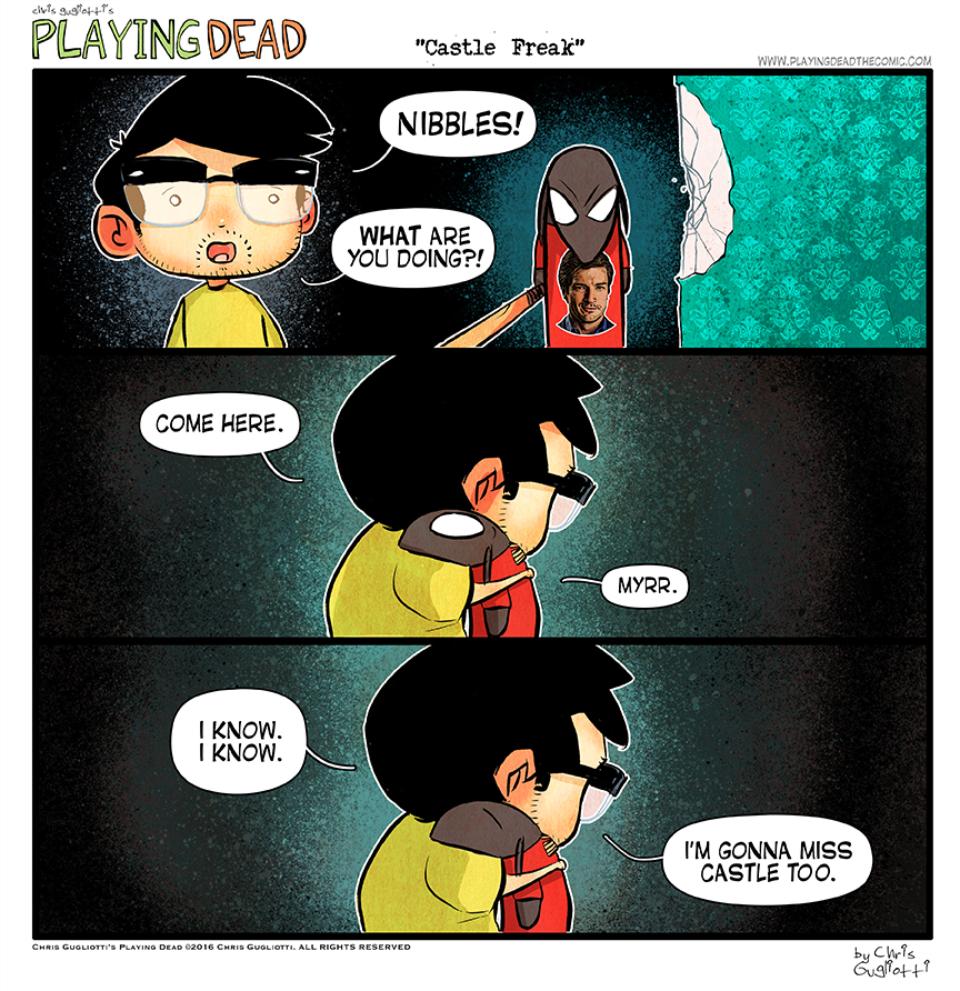 Castle Freak by cgugliotti on May 17, 2016 at 9:00 am Chapter: comics In which I help Nibbles cope with a loss. └ Tags: autobiographical, becket, castle, chris gugliotti, comic strip, dachshund, dog, Firefly, friendship, life, man's best friend, man-child, Nathan fillion, nibbles, nibbles the dachshund, playing dead, web comic, Web comics, webcomic, webcomics Comments Off on Castle Freak
