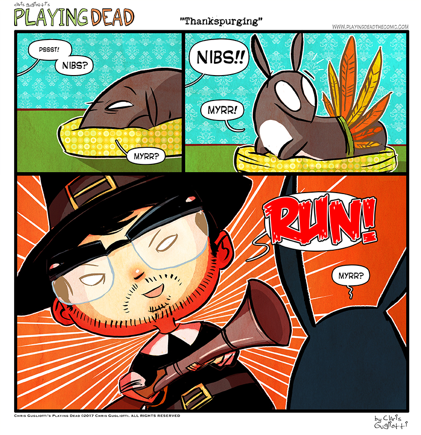 Thankspurging by cgugliotti on November 22, 2017 at 9:00 am Chapter: comicsCharacters: chris, nibbles In which Nibbles has a 10 second head start └ Tags: autobiographical, blunderbuss, chris gugliotti, comic, comic strip, dachshund, dog, friendship, holidays, hunting, life, man's best friend, nibbles, nibbles the dachshund, pilgrim, playing dead, thanksgiving, turkey, web comic, Web comics, webcomic, webcomics, wtf Comments Off on Thankspurging