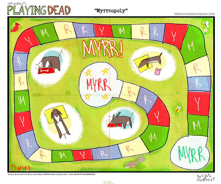 Myrrnopoly by cgugliotti on June 9, 2016 at 9:00 am Chapter: comics In which you don’t pass go and go directly to nap. └ Tags: autobiographical, board game, board games, chris gugliotti, comic, comic strip, dachshund, dog, friendship, life, magic, man's best friend, man-child, monopoly, myrr, nibbles, nibbles the dachshund, playing dead, the game of life, web comic, Web comics, webcomic, webcomics Comments Off on Myrrnopoly