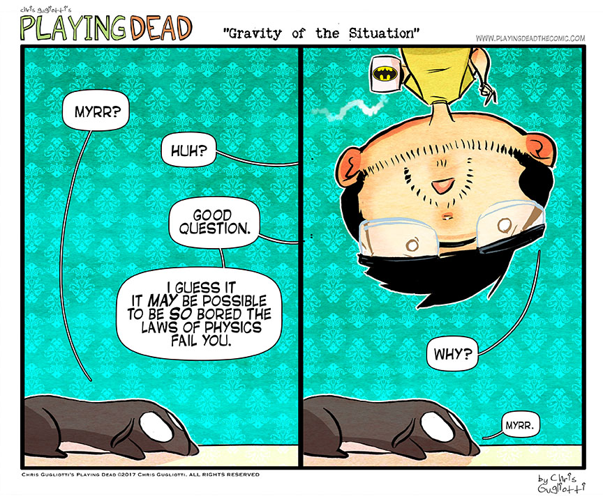 Gravity of the Situation by cgugliotti on August 30, 2017 at 9:00 am Chapter: comicsCharacters: chris, nibbles In which Nibbles learns Newtons first law of boredom. └ Tags: anxiety, autobiographical, boredom, chris gugliotti, comic, comic strip, dachshund, dog, ennui, friendship, gravity, introspection, life, man's best friend, man-child, newtons laws, nibbles, nibbles the dachshund, playing dead, web comic, Web comics, webcomic Comments Off on Gravity of the Situation