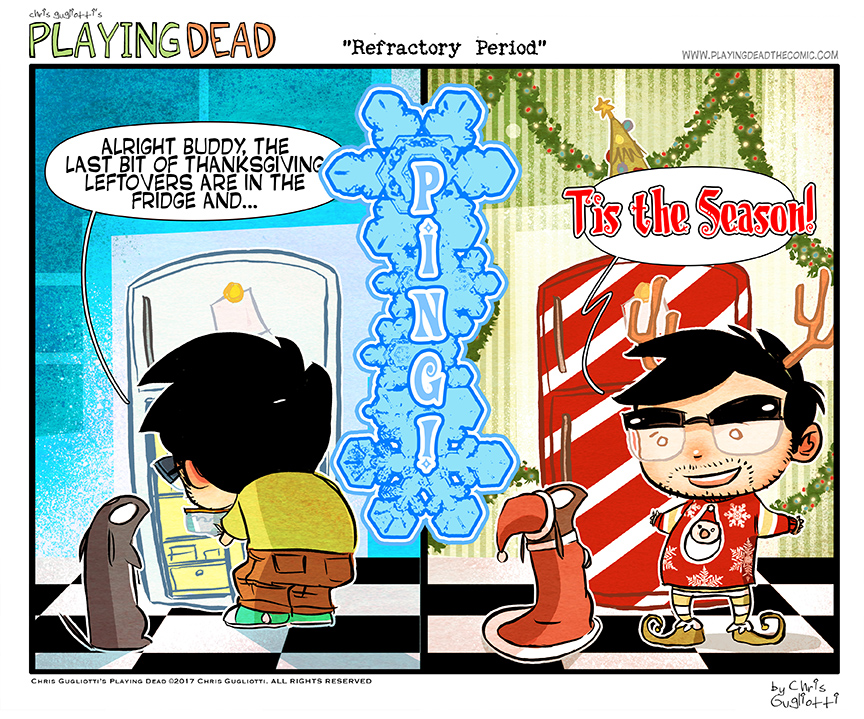 Refractory Period by cgugliotti on November 29, 2017 at 9:00 am Chapter: comicsCharacters: chris, nibbles In which it gets real! └ Tags: autobiographical, change of the season, chris gugliotti, christmas, christmas time, comic, comic strip, dachshund, dog, friendship, holiday season, holidays, leftovers, life, magic, man's best friend, nibbles, nibbles the dachshund, playing dead, refractory period, thanksgiving, web comic, Web comics, webcomic, webcomics, wtf, xmas Comments Off on Refractory Period