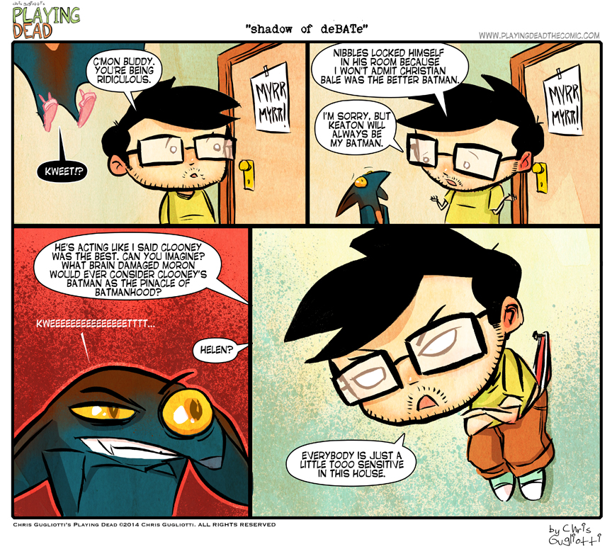 Shadow of DeBATe by cgugliotti on February 13, 2014 at 7:04 am Chapter: comics In which I strike a nerve. Keaton>Bale! └ Tags: autobiographical, batman, chris gugliotti, christian bale, comic, comic strip, dachshund, friendship, george clooney, introspection, life, man's best friend, man-child, michael keaton, nibbles, playing dead, the batman, the dark knight, web comic, Web comics, webcomic, webcomics 1 Comment