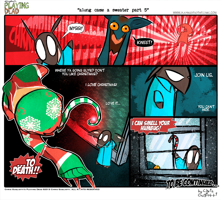 Along Came a Sweater part 5 by cgugliotti on December 17, 2013 at 8:49 am Chapter: comics Our Christmas adventure continues as all Holiday Hell breaks loose. └ Tags: along came a sweater, Animated, chris gugliotti, christmas, christmas adventure, christmas sweater, comic, comic strip, dachshund, dog, friendship, Gif, holiday, holidays, horror, man's best friend, Marvel comics, monster, nibbles, playing dead, santa, science fiction, web comic, Web comics, webcomic, webcomics, xmas 1 Comment