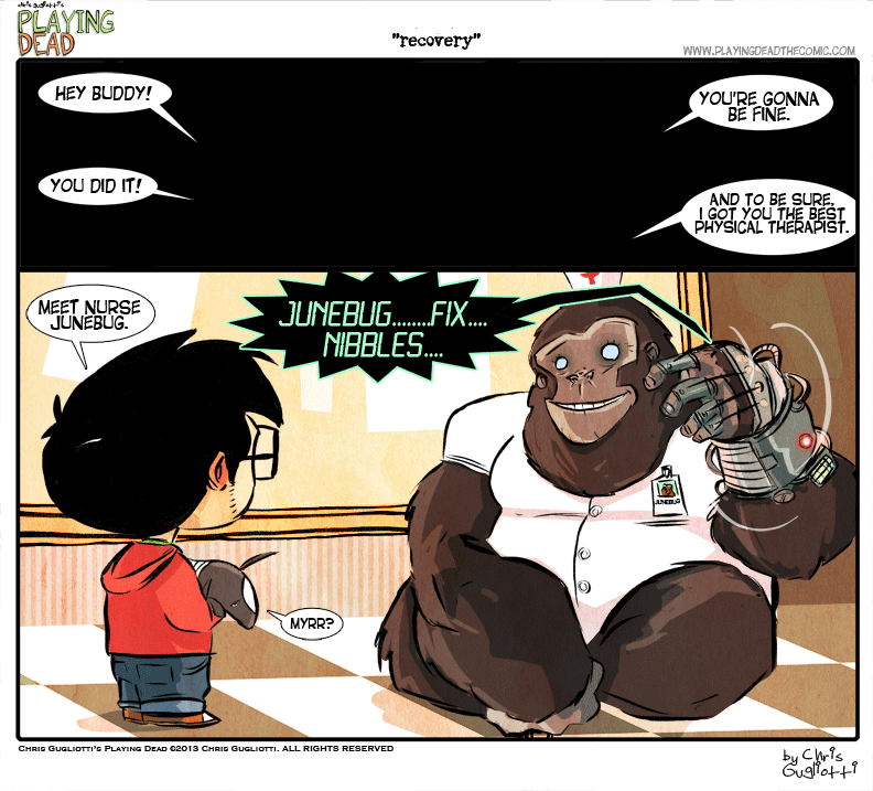 Recovery by cgugliotti on April 25, 2013 at 7:50 am Chapter: comics In which Nibbles meets his physical therapist. └ Tags: Animated, anxiety, autobiographical, chris gugliotti, comic, comic strip, congo, dachshund, dog, friendship, Gif, gorilla, life, man's best friend, medical, medicine, monkey, nibbles, physical therapy, playing dead, web comic, webcomic 1 Comment