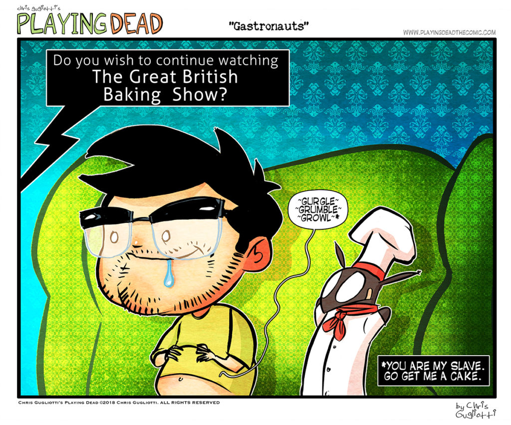Gastronauts by cgugliotti on February 14, 2018 at 9:00 am Chapter: comicsCharacters: chris, nibbles In which we veg out like delicious delicious potatoes └ Tags: autobiographical, baking, chris gugliotti, comic, comic strip, couch potato, couchpotato, dachshund, dog, food, food shows, friendship, great british bake off, life, man's best friend, nibbles, nibbles the dachshund, playing dead, tc, television, web comic, Web comics, webcomic, webcomics Comments Off on Gastronauts
