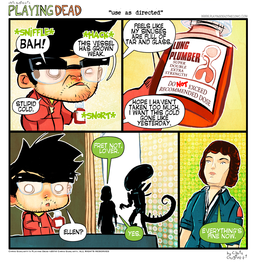 Use as directed by cgugliotti on November 13, 2014 at 8:32 am Chapter: comics In which I may have exceeded the recommended dosage. └ Tags: alien, aliens, autobiographical, chris gugliotti, cold, comic, comic strip, cough syrup, ellen, ellen ripley, fantasy, hallucination, life, man's best friend, man-child, playing dead, science fiction, sickness, sigourney weaver, web comic, Web comics, webcomic, webcomics, wtf, xenomorph Comments Off on Use as directed