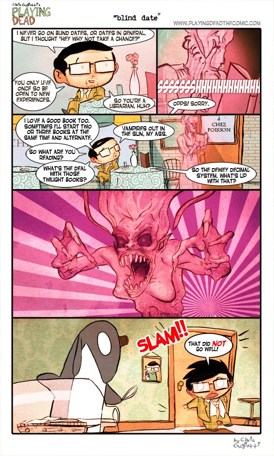 Blind Date by cgugliotti on August 29, 2012 at 8:04 am Chapter: comics In which I learn to respect the need for silence when wooing the dead. └ Tags: Animated, autobiographical, blind date, chris gugliotti, comic, comic strip, dacshund, dating, dating tips, dead, dog, ghost, ghostbusters, Gif, life, man's best friend, man-child, nibbles, silence, web comic, webcomic 1 Comment