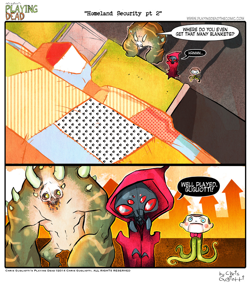 Homeland Security part 2 by cgugliotti on May 1, 2014 at 8:29 am Chapter: comics In which we see results. └ Tags: autobiographical, Blanket, chris gugliotti, comic, comic strip, dachshund, defense against monsters, defense against the dark arts, dog, friendship, kid logic, life, man's best friend, man-child, monsters, nibbles, playing dead, science fiction, web comic, Web comics, webcomic, webcomics Comments Off on Homeland Security part 2