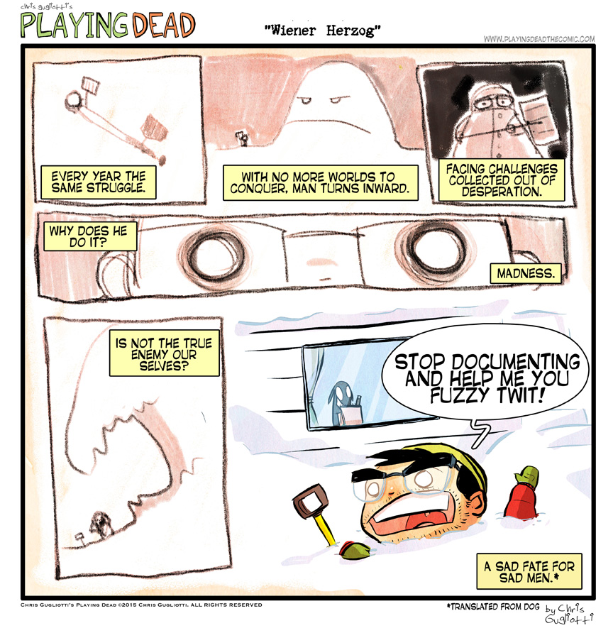 Wiener Herzog by cgugliotti on February 17, 2015 at 9:00 am Chapter: comics In which it’s funnier if you imagine it being read in a very humorless German accent. └ Tags: anxiety, autobiographical, chris gugliotti, comic, comic strip, dachshund, documentary, dog, friendship, introspection, life, man's best friend, nibbles, playing dead, seasonal affective disorder, snow, web comic, Web comics, webcomic, webcomics, werner herzog, winter Comments Off on Wiener Herzog