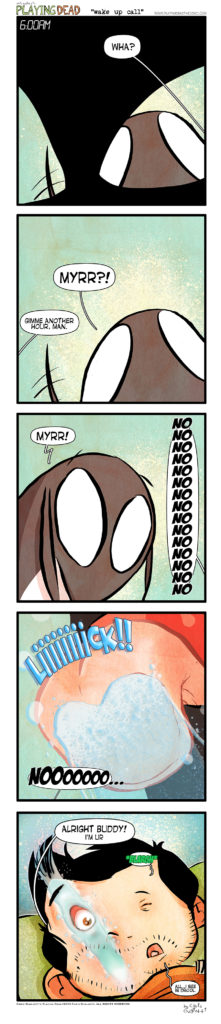 Wake Up Call by cgugliotti on November 10, 2016 at 9:00 am Chapter: comicsCharacters: chris, nibbles In which Nibs makes a damp alarm clock. └ Tags: anxiety, autobiographical, chris gugliotti, comic strip, dachshund, dog, dog breathe, friendship, horror, licking, life, man's best friend, nibbles, nibbles the dachshund, playing dead, sleep, web comic, Web comics, webcomic, webcomics, wtf Comments Off on Wake Up Call