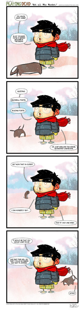 Not All Who Wander by cgugliotti on February 7, 2017 at 9:00 am Chapter: comicsCharacters: chris, nibbles In which anticipation is killing me └ Tags: anxiety, autobiographical, chris gugliotti, comic, comic strip, dachshund, dog, dog poop, friendship, life, man's best friend, man-child, nibbles, nibbles the dachshund, playing dead, snow, web comic, Web comics, webcomic, webcomics, wtf 1 Comment