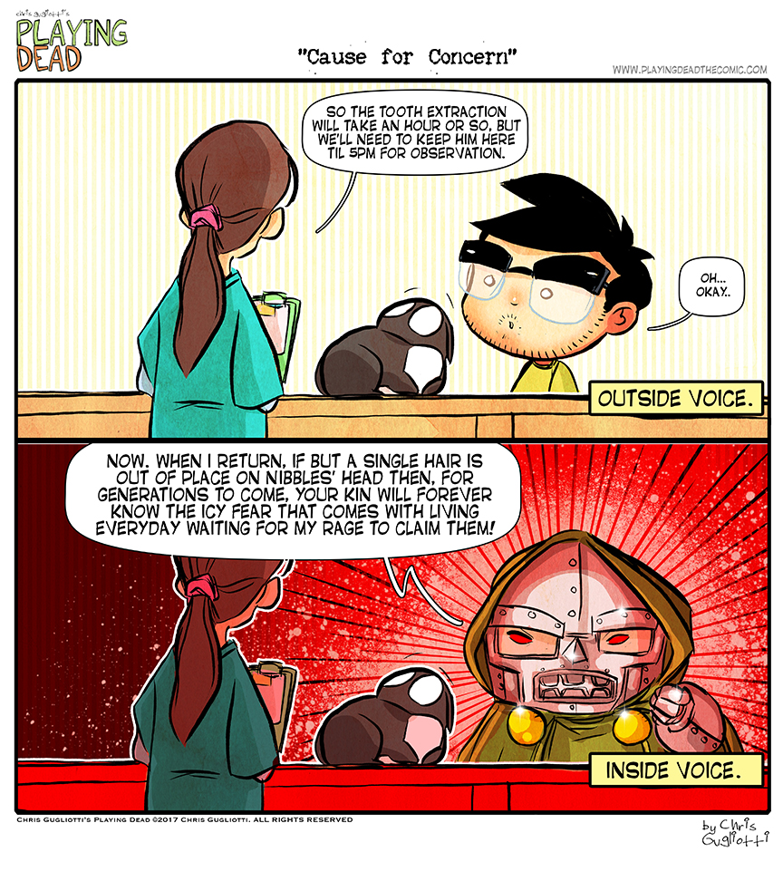 Cause for Concern by cgugliotti on May 16, 2017 at 9:00 am Chapter: comicsCharacters: chris, nibbles In which I try to mask my worry. └ Tags: anxiety, autobiographical, chris gugliotti, comic, comic strip, cosplay, dachshund, dog, dog teeth, friendship, introspection, life, man's best friend, man-child, nibbles, nibbles the dachshund, playing dead, veterinary medicine, web comic, Web comics, webcomic, webcomics, wtf 1 Comment
