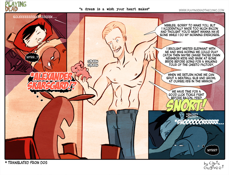 Dream is a Wish Part 2 by cgugliotti on September 24, 2012 at 10:26 am Chapter: comics In which we learn that nibbles would trade me in in a second for a sleeker sexier model. └ Tags: alexander skarsgard, chris gugliotti, comic, comic strip, dacshund, daschund, dog, dreams, eric northman, friendship, man's best friend, nibbles, true blood, web comic, webcomic, wtf Comments Off on Dream is a Wish Part 2