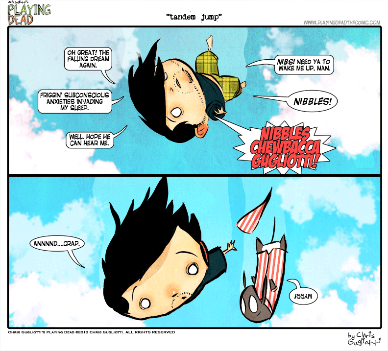 Tandem Jump by cgugliotti on May 9, 2013 at 7:53 am Chapter: comics In which when it comes to having a dream buddy, one of you should always pack a parachute. └ Tags: Animated, anxiety, autobiographical, chris gugliotti, clouds, comic, comic strip, dachshund, dog, dreaming, dreams, drop, falling, friendship, Gif, introspection, life, man's best friend, nibbles, playing dead, sky, skydiving, web comic, webcomic 1 Comment