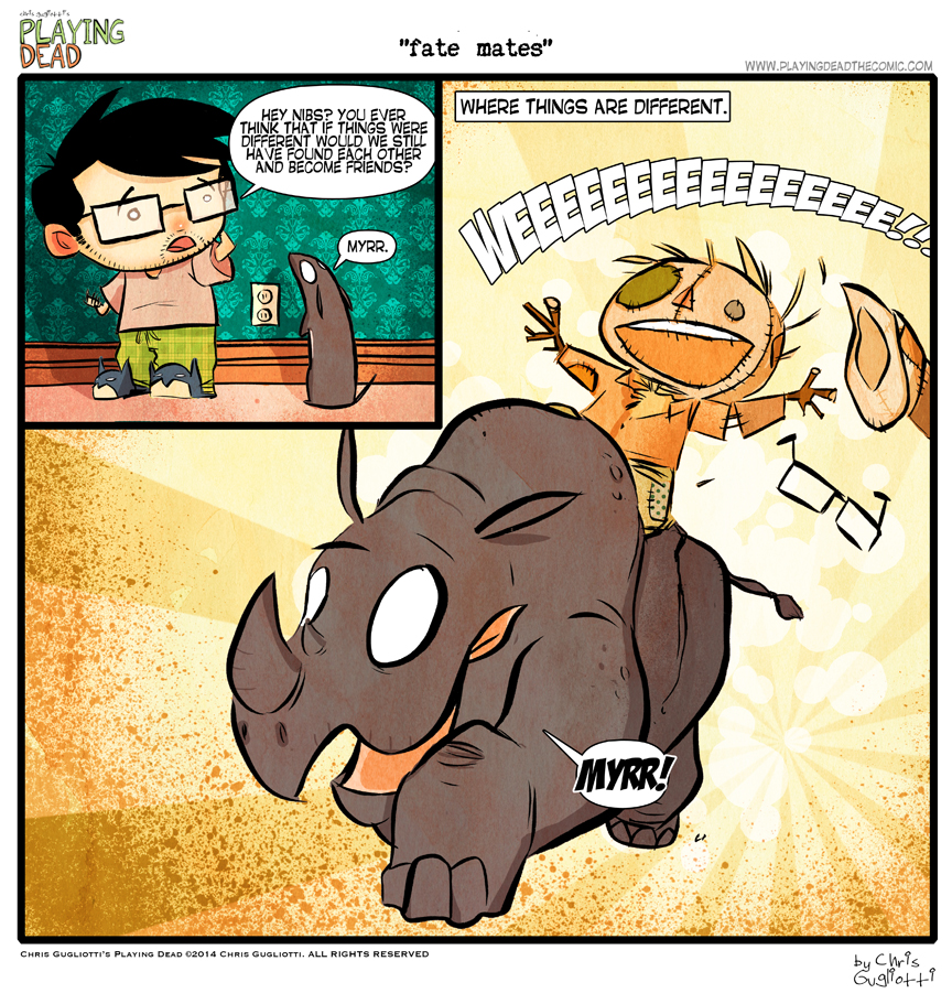 Fate Mates by cgugliotti on March 13, 2014 at 8:11 am Chapter: comics In which we ponder friendship, fate, and the multiverse. └ Tags: autobiographical, chris gugliotti, comic, comic strip, dachshund, dog, fate, friendship, introspection, life, man's best friend, man-child, multiverse, nibbles, playing dead, rhino, rhinoceros, scarecrow, web comic, Web comics, webcomic, webcomics 1 Comment