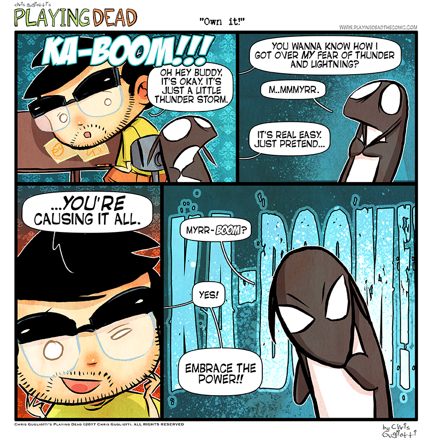 Own It by cgugliotti on August 9, 2017 at 9:00 am Chapter: comicsCharacters: chris, nibbles In which Nibs learns to harness his fear └ Tags: anxiety, autobiographical, chris gugliotti, comic, comic strip, dachshund, dog, fantasy, Fear, friendship, introspection, life, lightning, man's best friend, nibbles, nibbles the dachshund, playing dead, thunder, thunderstorm, web comic, Web comics, webcomic, webcomics, wtf 1 Comment