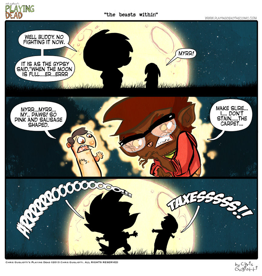 The Beasts Within by cgugliotti on June 5, 2014 at 6:59 am Chapter: comics In which when the moon is full the monsters come out!!!!!! └ Tags: chris gugliotti, comic, comic strip, dachshund, friendship, full moon, horror, life, man's best friend, monster, monsters, moon, nibbles, playing dead, transformation, web comic, Web comics, webcomic, webcomics, werehuman, Werewolf Comments Off on The Beasts Within