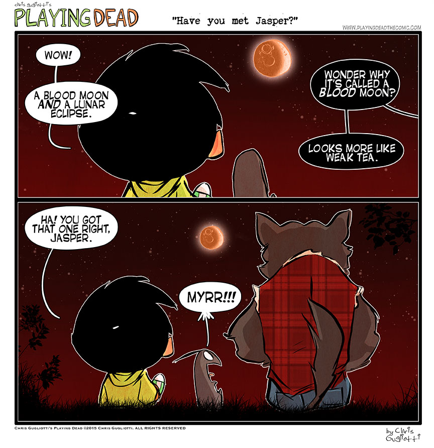 Have you met Jasper? by cgugliotti on October 6, 2015 at 9:00 am Chapter: comics In which we enjoy a celestial event with a friend. └ Tags: autobiographical, blood moon, chris gugliotti, comic, comic strip, dachshund, dog, fantasy, friendship, full moon, HALLOWEEN, horror, life, lunar eclipse, magic, man's best friend, monster, moon, nibbles, playing dead, web comic, Web comics, webcomic, webcomics, Werewolf Comments Off on Have you met Jasper?