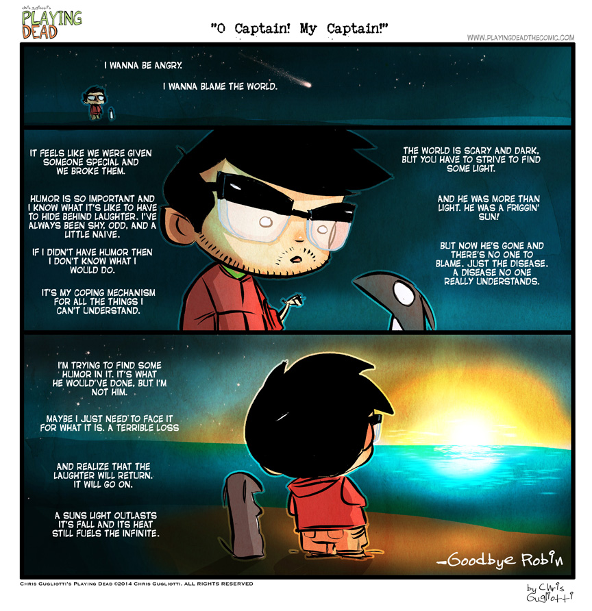 O Captain! My Captain! by cgugliotti on August 21, 2014 at 12:05 am Chapter: comics In which we say a goodbye. └ Tags: autobiographical, chris gugliotti, comic, comic strip, dachshund, depression, dog, goodbyes, grief, humor, introspection, life, mental illness, playing dead, robin williams, Sadness, web comic, Web comics, webcomic, webcomics Comments Off on O Captain! My Captain!