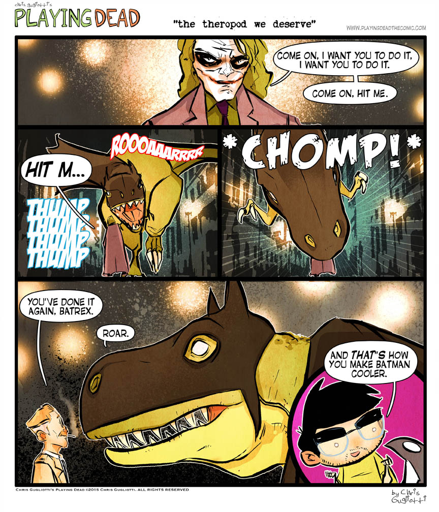 └ Tags: autobiographical, batman, chris gugliotti, comic, comic strip, commissioner gordon, dachshund, dc, dc comics, dino, dinosaur, dinosaurs, dog, fantasy, friendship, gotham, gotham city, heath ledger, heath ledger joker, joker, jurassic park, jurassic world, life, man's best friend, man-child, nibbles, playing dead, science fiction, t-rex, the batman, the dark knight, the joker, tyranosaurus, tyranosaurus rex, web comic, Web comics, webcomic, webcomics