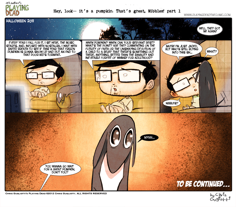 Hey, look– it’s a pumpkin. That’s great, Nibbles! part 1 by cgugliotti on October 18, 2012 at 9:29 am Chapter: comics In which we begin our Halloween tale. └ Tags: adventure, Animated, autobiographical, chris gugliotti, comic, comic strip, dacshund, daschund, dog, friendship, Gif, HALLOWEEN, Hey, look-- it’s a pumpkin. That’s great, man's best friend, man-child, nibbles, pumpkin, the great pumpkin, web comic, webcomic Comments Off on Hey, look– it’s a pumpkin. That’s great, Nibbles! part 1