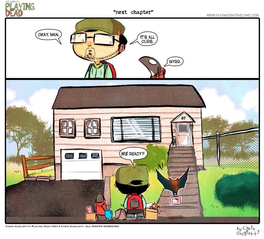 Next Chapter by cgugliotti on September 26, 2013 at 8:28 am Chapter: comics Art finally imitates life as me and nibbles take our first steps into a whole new world. └ Tags: anxiety, art, autobiographical, bat, chris gugliotti, comic, comic strip, dachshund, dog, friendship, fruit bat, helen, home, house, introspection, life, man's best friend, mr bear, new home, nibbles, playing dead, teddy bear, web comic, Web comics, webcomic, webcomics 3 Comments