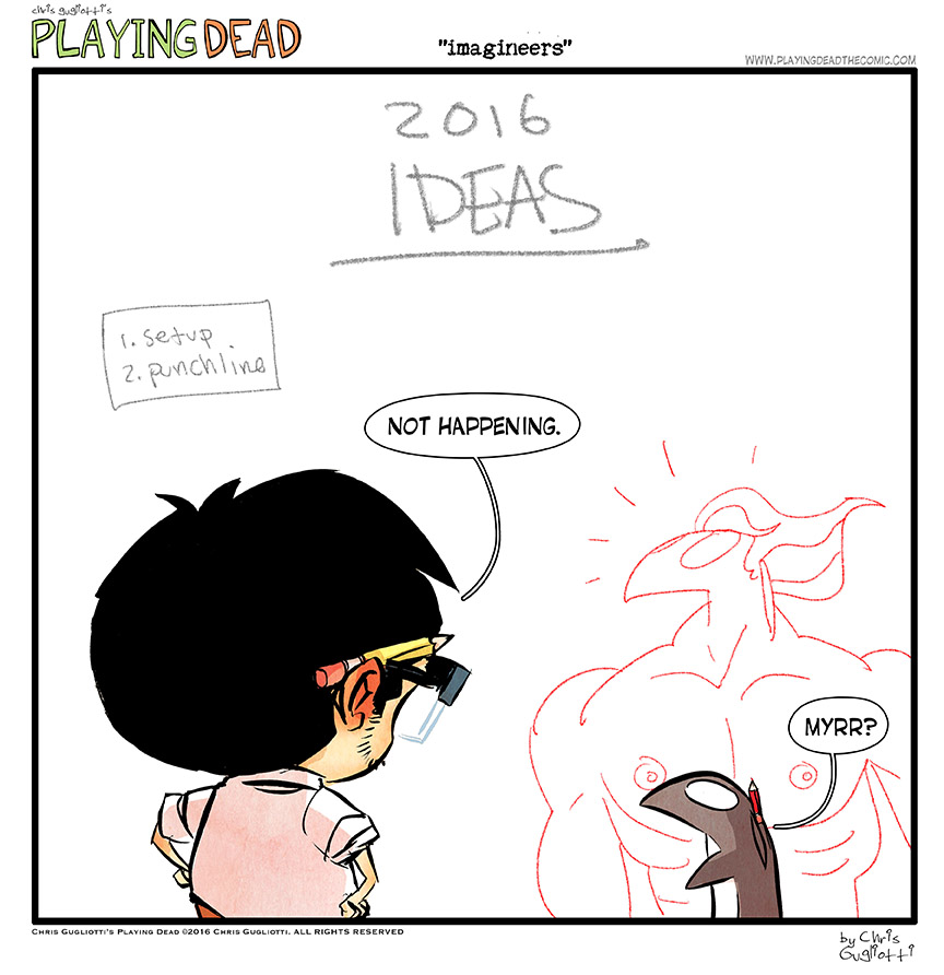 Imagineers by cgugliotti on January 7, 2016 at 9:00 am Chapter: comics In which Nibbles shares some new ideas for improving the strip. └ Tags: anxiety, autobiographical, chris gugliotti, comic, comic strip, dachshund, dog, friendship, imagineer, introspection, life, man's best friend, new year, nibbles, nibbles the dachshund, playing dead, web comic, Web comics, webcomic, webcomics, wtf 1 Comment