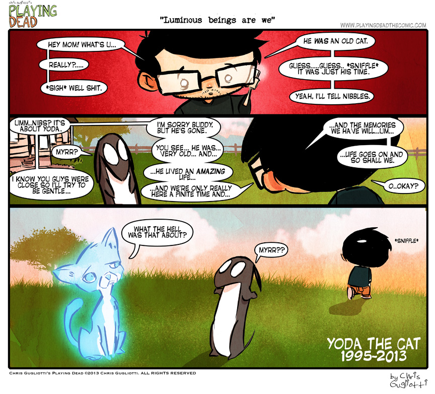 Luminous beings are we by cgugliotti on July 9, 2013 at 9:06 am Chapter: comics In which we say goodbye to an old friend. └ Tags: autobiographical, chris gugliotti, comic, comic strip, dachshund, dog, friendship, in memorium, introspection, life, nibbles, playing dead, web comic, webcomic, yoda 1 Comment