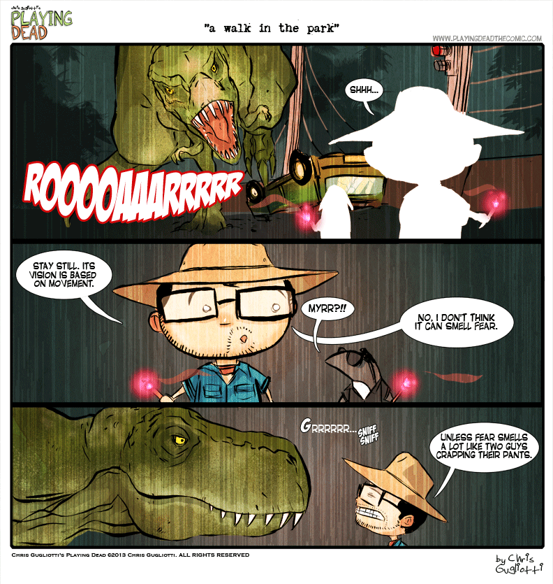 A Walk in the Park by cgugliotti on April 16, 2013 at 8:04 am Chapter: comics In which we learn Paleontology 101: Always bring spare underpants └ Tags: Animated, anxiety, chris gugliotti, dachshund, dinosaur, dinosaurs, dog, friendship, Gif, jeff godblum, jurassic park, man's best friend, nibbles, sam neil, science fiction, semi-autobiographical, t-rex, terror, tyranosaurus, tyranosaurus rex, web comic, webcomic Comments Off on A Walk in the Park