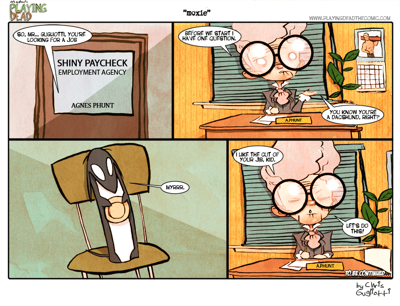 The Job Hunt Begins by cgugliotti on July 27, 2012 at 10:12 am Chapter: comics So what if you have no college degree and incredibly stubby arms and legs! └ Tags: Animated, autobiographical, comic, comic strip, cute, dacshund, daschund, dog, employment, Gif, job, job search, life, nibbles, unemployment, web comic, webcomic 1 Comment