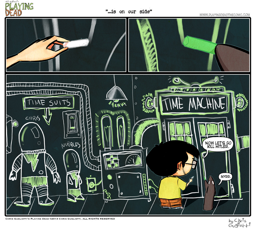 …is on our side. by cgugliotti on June 25, 2013 at 8:32 am Chapter: comics In which our most powerful weapon is IMAGINATION!!! └ Tags: autobiographical, chalkboard, chris gugliotti, comic, comic strip, dachshund, dog, friendship, killing hitler, life, man's best friend, man-child, nibbles, playing dead, science fiction, srt, time machine, time travel, web comic, webcomic Comments Off on …is on our side.