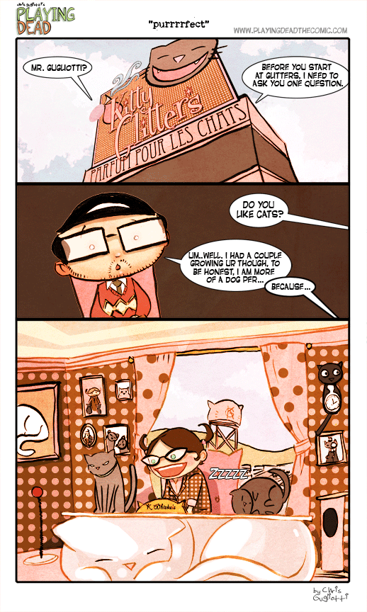 Perfume For Cats by cgugliotti on July 30, 2012 at 10:26 am Chapter: comics Kitty Glitters tests all their perfume for cats on convicted felons and the Irish. └ Tags: Animated, autobiographical, awkward moment, career opportunities, cat, cat lover, cats, comic, comic strip, Gif, job, job hunt, kitties, kitty, life, web comic, webcomic Comments Off on Perfume For Cats