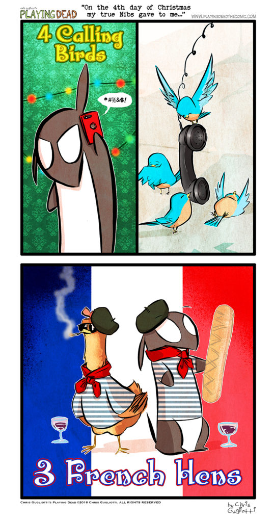 On the 4th Nibs of Christmas… by cgugliotti on December 15, 2016 at 9:00 am Chapter: comicsCharacters: nibbles In which it’s all about birds again. └ Tags: 12 days of christmas, 12 nibs of christmas, 3 french hens, 4 calling birds, autobiographical, chris gugliotti, christmas, christmas adventure, comic, comic strip, cosplay, dachshund, dog, fantasy, happy christmas, happy holidays, holidays, magic, merry christmas, nibbles, nibbles the dachshund, playing dead, web comic, Web comics, webcomics, xmas Comments Off on On the 4th Nibs of Christmas…