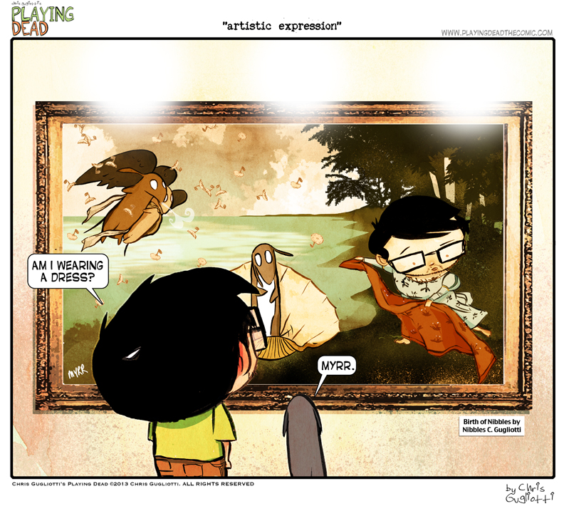 Artistic Expression by cgugliotti on February 6, 2013 at 8:35 am Chapter: comics In which Nibbles expresses his creativity └ Tags: art, birth of venus, Botticelli, chris gugliotti, comic, comic strip, dacshund, dog, friendship, man's best friend, man-child, museum, myrr, nibbles, playing dead, web comic, webcomic 1 Comment