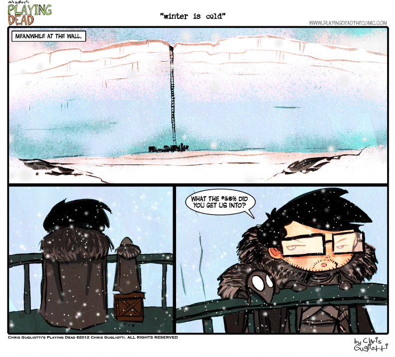 Winter is Here by cgugliotti on December 28, 2012 at 8:12 am Chapter: comics In which we contemplate life’s little diversions. └ Tags: Animated, chris gugliotti, comic, comic strip, cosplay, dacshund, dog, friendship, game of thrones, Gif, ice, jon snow, life, man's best friend, Men of the Night's Watch, nibbles, Night's Watch, playing dead, snow, the wall, web comic, webcomic Comments Off on Winter is Here