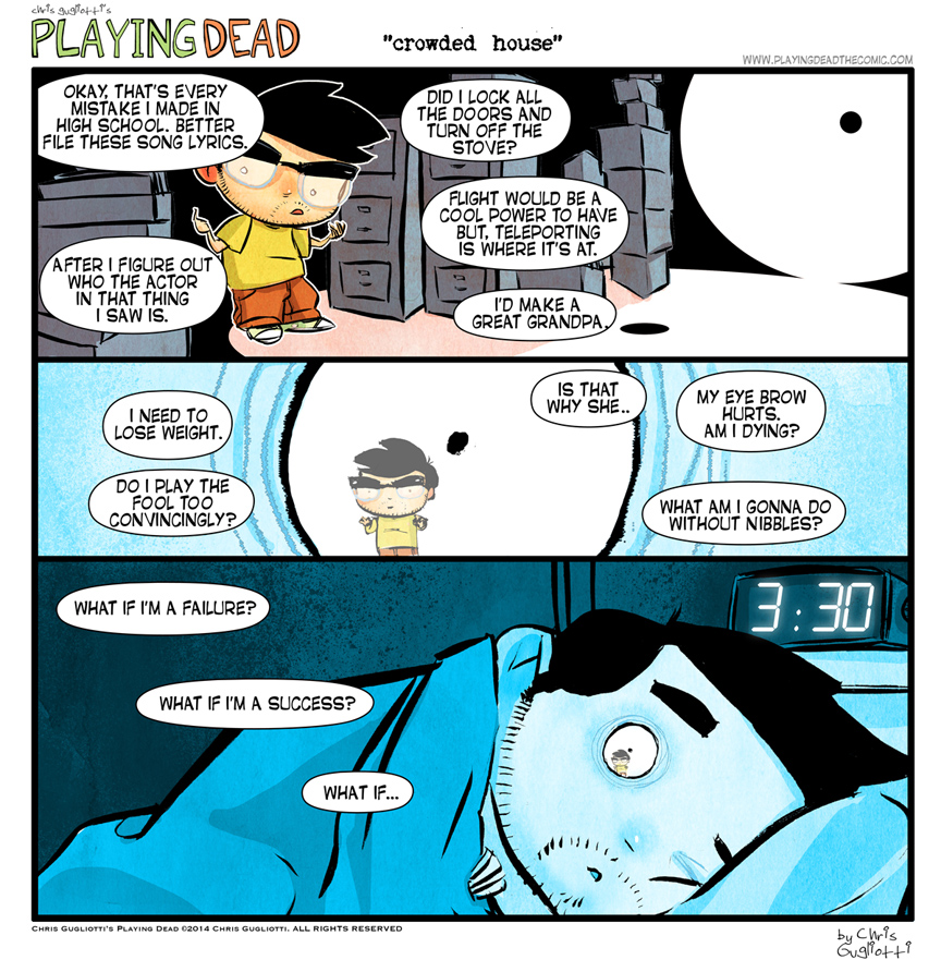 Crowded House by cgugliotti on November 4, 2014 at 9:29 am Chapter: comics In which sleep is overrated and who wouldn’t want 8 extra hours?! └ Tags: anxiety, autobiographical, chris gugliotti, comic, comic strip, insomnia, introspection, life, man-child, over thinking, playing dead, the mind, thinking, thoughts, web comic, Web comics, webcomic, webcomics Comments Off on Crowded House