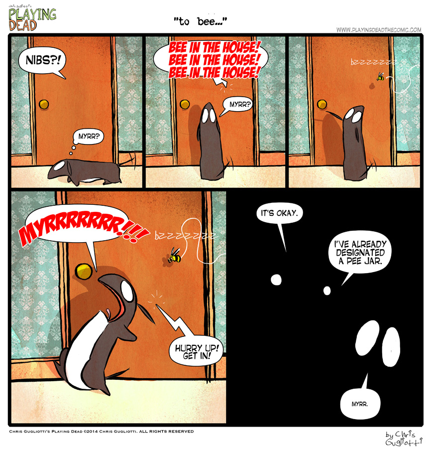 To bee… by cgugliotti on July 1, 2014 at 7:41 am Chapter: comics In which it is always important to have spare empty jars └ Tags: anxiety, bee, bees, bug, bugs, chris gugliotti, comic, comic strip, dachshund, dog, Fear, fear of bees, friendship, insect, insects, life, man's best friend, man-child, nibbles, not the bees, panic, playing dead, web comic, Web comics, webcomic, webcomics Comments Off on To bee…