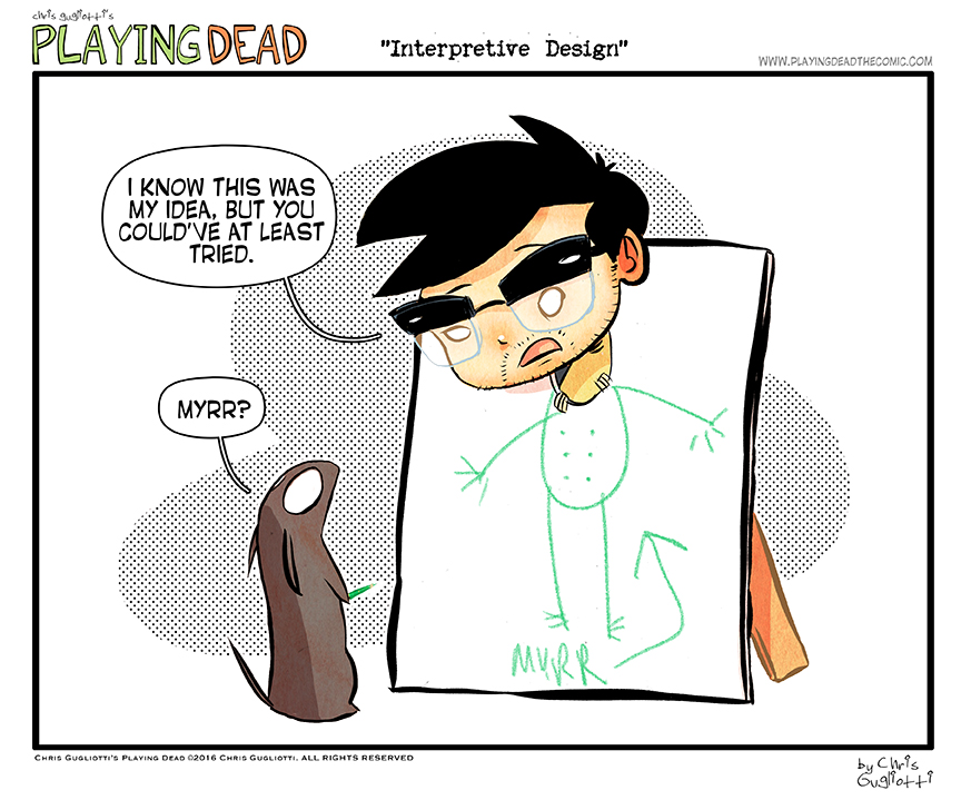 Interpretive Design by cgugliotti on August 25, 2016 at 9:00 am Chapter: comics In which Nibs expresses himself through art. └ Tags: anxiety, art, artist, artistic, autobiographical, chris gugliotti, comic, comic strip, dachshund, dog, friendship, introspection, life, man's best friend, man-child, nibbles the dachshund, pictionary, playing dead, Web comics, webcomic, webcomics, win lose or draw Comments Off on Interpretive Design