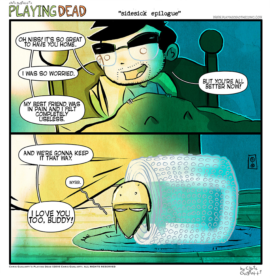 Sidesick: Epilogue by cgugliotti on April 12, 2016 at 9:00 am Chapter: comics In which, after all we’ve been through, I take precautions. HELP NIBBLES FUND └ Tags: anxiety, autobiographical, chris gugliotti, comic, comic strip, dachshund, dog, dog care, dog health, doxie love, friendship, life, man's best friend, man-child, nibbles, nibbles the dachshund, playing dead, precautions, veterinary medicine, web comic, Web comics, webcomics Comments Off on Sidesick: Epilogue