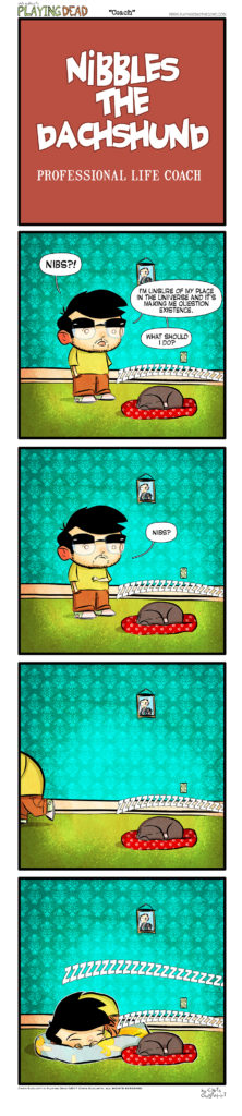 Coach by cgugliotti on January 10, 2017 at 9:00 am Chapter: comicsCharacters: chris, nibbles In which I go to the master for guidance. └ Tags: anxiety, autobiographical, chris gugliotti, comic, comic strip, dachshund, dog, friendship, introspection, life, life coach, man's best friend, man-child, nibbles, nibbles the dachshund, playing dead, self help, web comic, Web comics, webcomic, webcomics 1 Comment
