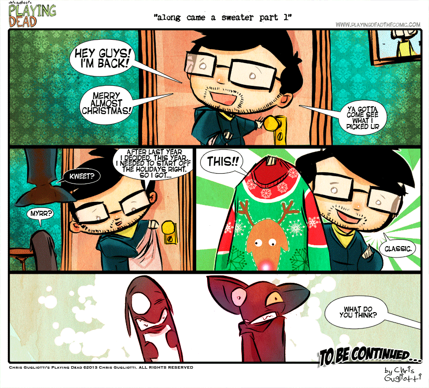 Along Came a Sweater part 1 by cgugliotti on December 3, 2013 at 8:32 am Chapter: comics In which this years Christmas adventure begins! └ Tags: along came a sweater, Animated, autobiographical, bat, chris gugliotti, christmas, christmas adventure, christmas sweater, comic, dachshund, dog, friendship, Gif, holiday sweater, holidays, man's best friend, man-child, playing dead, science fiction, shopping, web comic, Web comics, webcomic, webcomics, xmas 1 Comment