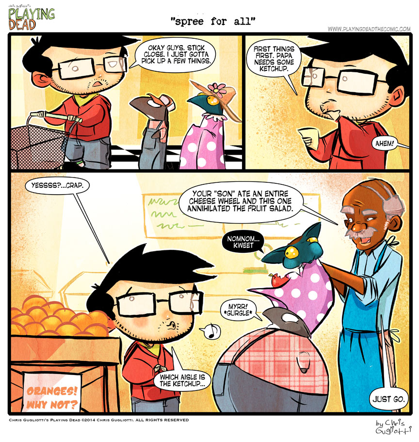 Spree For All by cgugliotti on April 17, 2014 at 6:13 am Chapter: comics In which you can dress some people up, but you can’t take me out. └ Tags: autobiographical, bat, chris gugliotti, comic, comic strip, dachshund, dog, friendship, groceries, ketchup, kids, life, man's best friend, nibbles, playing dead, shopping, web comic, Web comics, webcomic, webcomics Comments Off on Spree For All