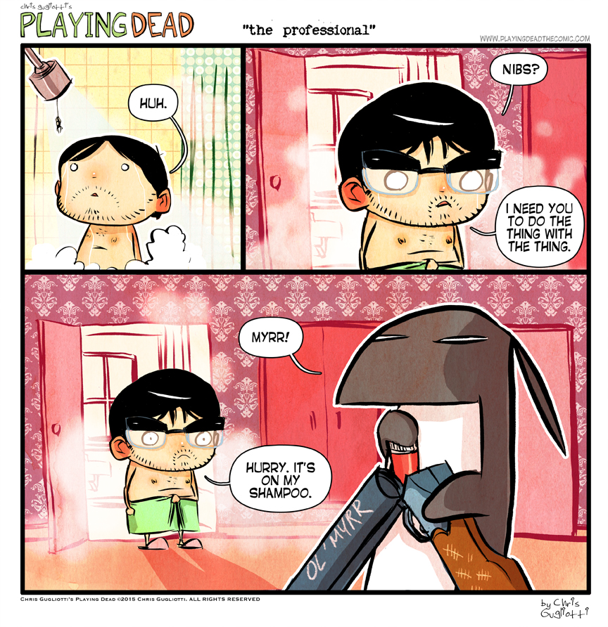 The Professional by cgugliotti on April 9, 2015 at 9:01 am Chapter: comics In which Nibbles is my hero. └ Tags: anxiety, Arachnophobia, autobiographical, avengers, canine, chris gugliotti, comic, comic strip, dachshund, dog, Fear, fear of spiders, friendship, justice, life, man's best friend, man-child, nibbles, playing dead, professional, shotgun, shower, Spider, spiders, the professional, web comic, Web comics, webcomic, webcomics Comments Off on The Professional
