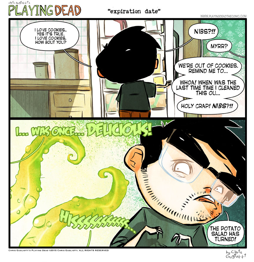 Expiration Date by cgugliotti on July 28, 2015 at 9:00 am Chapter: comics In which leftovers are either thrown out or live long enough to become the bad guy. └ Tags: anxiety, autobiographical, chris gugliotti, comic, comic strip, dachshund, dog, expiration date, expired, expired food, fantasy, food, friendship, gross, harrison ford, horror, introspection, leftovers, life, man's best friend, nibbles, playing dead, science fiction, spoiled food, tentacles, web comic, Web comics, webcomic, webcomics, wtf Comments Off on Expiration Date