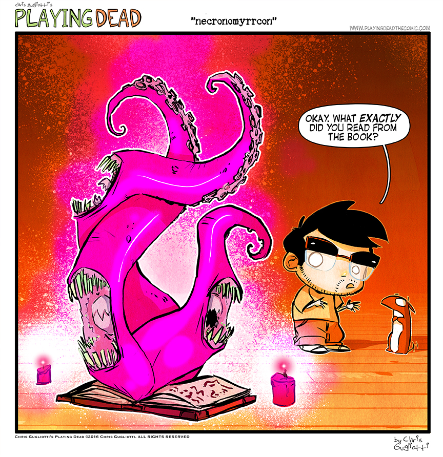 Necronomyrrcon by cgugliotti on January 21, 2016 at 9:00 am Chapter: comics In which things get “groovy”. └ Tags: ash versus the evil dead, autobiographical, black magic, chris gugliotti, comic, comic strip, dachshund, Daredevil, dog, evil, evil dead, fantasy, friendship, horror, horror movie, life, magic, man's best friend, man-child, necrnomicon, nibbles, nibbles the dachshund, playing dead, sam raimi, tentacles, the evil dead, web comic, Web comics, webcomic, webcomics, wtf Comments Off on Necronomyrrcon