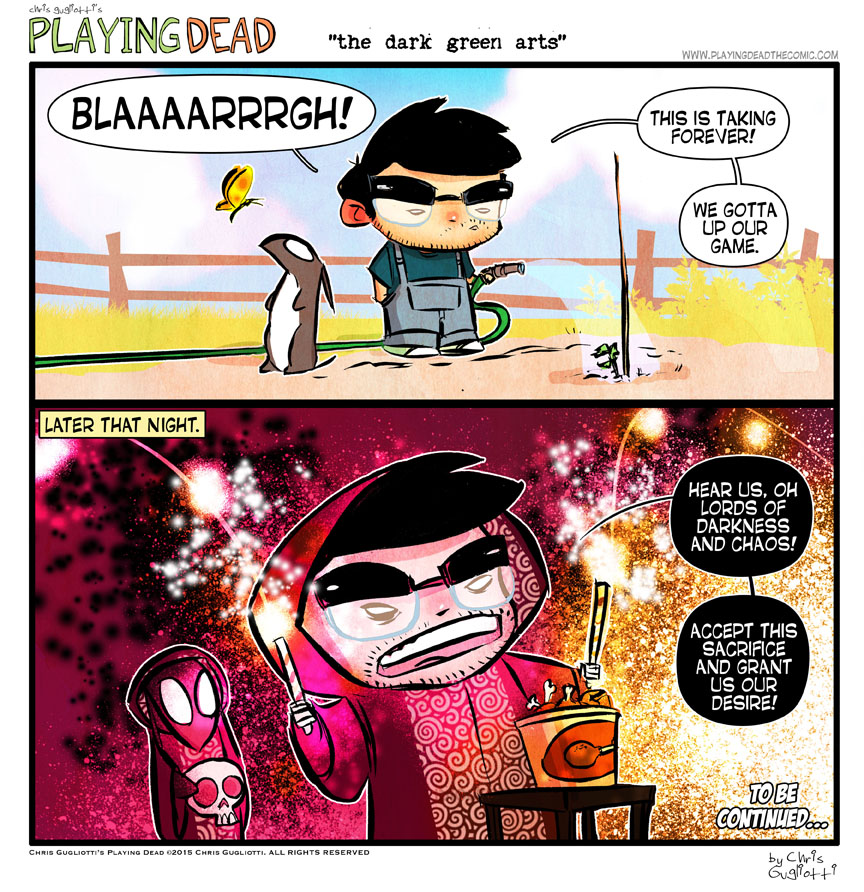 The Dark Green Arts by cgugliotti on July 21, 2015 at 9:00 am Chapter: comics In which we seek help with our crops. └ Tags: anxiety, autobiographical, black magic, chris gugliotti, comic, comic strip, dachshund, dog, extreme gardening, fantasy, friendship, garden, gardening, horror, introspection, life, magic, man's best friend, man-child, nibbles, playing dead, the dark arts, web comic, Web comics, webcomic, webcomics, wtf Comments Off on The Dark Green Arts