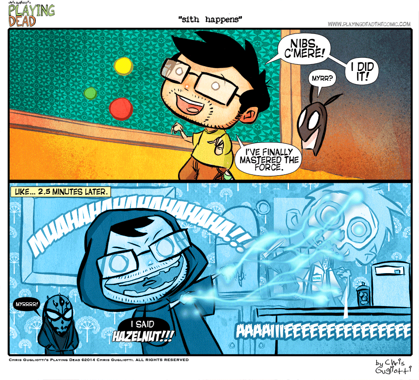 Sith Happens by cgugliotti on March 27, 2014 at 7:20 am Chapter: comics In which the path to the dark side is shorter than one may have expected. └ Tags: Animated, autobiographical, chris gugliotti, comic, comic strip, cosplay, dachshund, dacshund, dark side, darth maul, dog, friendship, Gif, introspection, jedi, life, man's best friend, man-child, nibbles, playing dead, science fiction, sith, Star wars, Starwars, the dark side of the force, the force, the jedi, the sith, web comic, Web comics, webcomic, webcomics Comments Off on Sith Happens