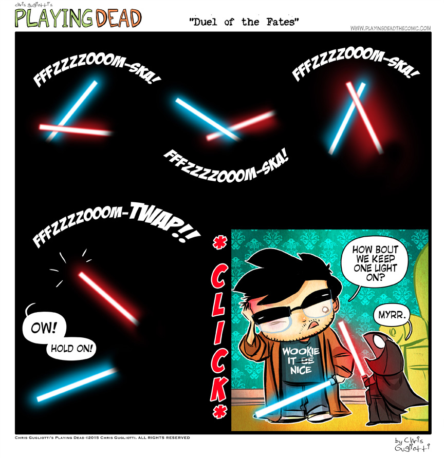 Duel of the Fates by cgugliotti on May 14, 2015 at 9:03 am Chapter: comics In which some safety precautions must be taken to avoid further injury. └ Tags: autobiographical, chris gugliotti, christmas adventure, comic, comic strip, cosplay, costume play, dachshund, darth vader, dog, dueling, episode 7, fantasy, friendship, geek, jedi, light saber, light sabers, man's best friend, man-child, nerd, nibbles, obi wan, playing dead, sci fi, science fiction, sith, Star wars, sword, swords, the force, the sith, web comic, Web comics, webcomic, webcomics, wookie, wtf, yoda Comments Off on Duel of the Fates