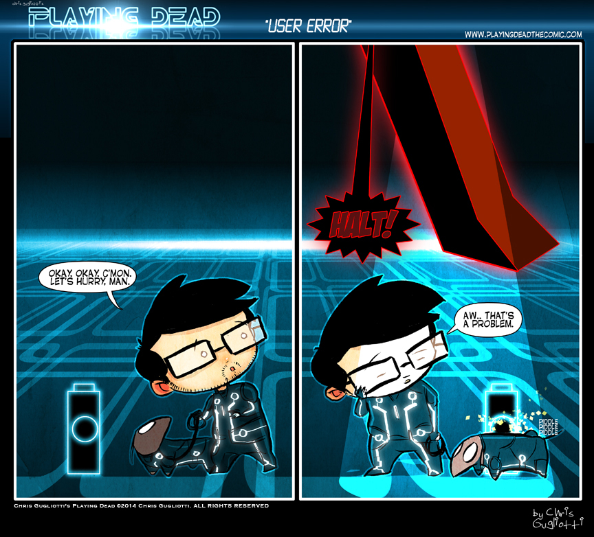User Error by cgugliotti on January 9, 2014 at 7:43 am Chapter: comics In which me and Nibs take a side trip to the grid. └ Tags: autobiographical, chris gugliotti, comic, comic strip, dachshund, dog, friendship, life, man's best friend, man-child, movie parody, nibbles, playing dead, sci fi, science fiction, tron, tron legacy, web comic, Web comics, webcomic, webcomics 1 Comment